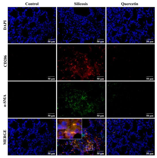 Myofibroblasts, which are characterized by the expression of α-smooth muscle actin (α-SMA), have the ability to synthesize collagen and deposit extracellular matrix (ECM) to promote silicosis. Recent studies have shown that macrophages derived from bone marrow cells can differentiate into α-SMA+ myofibroblasts within the injured kidney in a process termed the macrophage-to-myofibroblast transition (MMT) []. Cell lineage tracing studies by the adoptive transfer of GFP+ or dye-labelled macrophages (F4/80+) have identified that monocytes/macrophages from bone marrow can give rise to myofibroblasts in a mouse model of unilateral ureteric obstruction (UUO), accounting for more than 60% of α-SMA+ myofibroblasts. Furthermore, many Col I-producing cells isolated from the UUO kidney were bone-marrow-derived GFP + F4/80+ α-SMA+ cells with a predominant CD206+ M2 phenotype. The MMT process was regulated by TGF-β/Smad3 signaling, as the deletion of Smad3 in the bone marrow compartment of GFP+ chimeric mice and Smad3 null bone marrow macrophages in vitro []. The majority of MMT cells co-expressed macrophage (CD68 or CD206) and myofibroblast (a-SMA) markers in human and experimental renal allograft rejection. Fate-mapping in Lyz2-Cre/Rosa26-Tomato mice showed that approximately half of a-SMA+ myofibroblasts in renal allografts originated from the recipient’s bone-marrow-derived macrophages. The knockout of Smad3 protected against interstitial fibrosis in renal allografts and substantially reduced the number of MMT cells []. The MMT was associated with lung fibrosis in UUO rats, and this process was attenuated after treatment with eplerenone []. It was suggested that the MMT is one of the important mechanisms in myofibroblast formation and fibrosis. Nevertheless, there are few reports about the relationship between the MMT and silicosis. The previous study indicated that the positive expression of α-SMA was also found in macrophages in silicotic nodules and located in the membrane similar to “actin rings” stained by phalloidin, another commonly used marker for myofibroblasts []. The lost original phenotype macrophage may be related to the process of the MMT. In this study, we investigated the MMT in silicosis and whether quercetin regulated it.