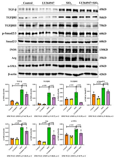 The expressions of TGF-β, TGFβRI, TGFβRII, p-Smad 2/3, iNOS, Arg, and α-SMA in SiO2-treated MH-S, measured by Western blot. Data are presented as the mean ± SD, n = 3 per group.