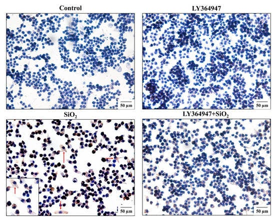 As TGF-β-Smad2/3 signaling plays a critical role in fibrosis, we investigated whether it regulates the MMT during silicosis. Western blot results revealed that LY364947, the inhibitor of the TGF-β receptor (TGFβR), led to a decrease in the expressions of TGF-β, TGFβRI, TGFβRII, and phosphorylated Smad 2/3 (p-Smad2/3) in SiO2-induced macrophages. Western blot indicated that LY364947 suppressed the expressions of iNOS, Arg, and α-SMA (Figure 10). As shown in Figure 11, LY364947 inhibited the expression of α-SMA compared with the SiO2-induced macrophages. These results suggested that the MMT can be regulated by the TGF-β-Smad2/3 signaling pathway.