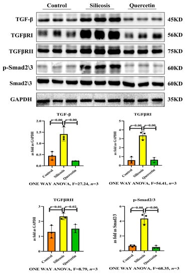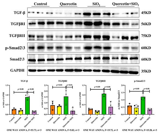 Compared with the control group, the expressions of TGF-β, TGFβRI, TGFβRII, and p-Smad 2/3 increased markedly in the SiO2 group, and this effect was attenuated by the quercetin treatment (Figure 12). The same changes were observed in the silicotic mice. The protein levels of TGF-β, TGFβRI, TGFβRII, and p-Smad 2/3 were also significantly higher in the silicotic mice and were decreased by quercetin treatment (Figure 13 and Figure 14). These results suggested that quercetin may regulate the TGF-β-Smad2/3 signaling pathway.