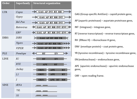 TEs are classified into retroelements (REs) and DNA-transposons (which change their location by the “cut and paste” or “rolling circle” mechanism). Transposition of REs occurs by reverse transcription of their mRNA and insertion of cDNA into a new locus. REs are subdivided into long terminal repeats containing (LTR-REs) and not containing them (non-LTR-REs) [1]. Non-LTR-REs include the orders DIRS (Dictyostelium discoideum retroelements), PLE (Penelope-like), LINE (long interspersed nuclear elements), and SINE (short interspersed nuclear elements). Each of these orders is classified into several superfamilies (Figure 1) which differ in structural features and mechanisms of movement. For example, PLEs encode an endonuclease (EN—endonuclease), similar to group II introns, and reverse transcriptase (RT—reverse transcriptase), similar to eukaryotic telomerase [13]. Modern online resources are used to classify miRNAs and predict their potential targets, such as mirDeep (for animals), Shortstack, mirDeep-P, mirPlant, miRA, PIPmiR, miR-PREFeR, and miRCat2 (for plants) [14].