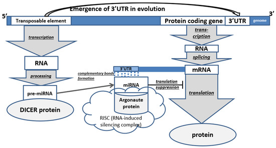 In animals, the main majority of all TEs are non-LTR retroelements (LINE and SINE). In humans, they occupy 35% of all DNA, in mice—28%, in Drosophila—17% [20]. miRNA precursor maturation (by cutting out a parts) is caused by specific enzymes; it initially occurs in the cell nucleus with the help of Drosha ribonuclease-III, after which the RNA is transported into the cytoplasm (with the help of Exportin-5) where it is acted upon by the DICER enzyme [16]. In animals, miRNAs interact with the 3′-UTRs of target mRNAs through partial base pairing (nucleotides 2 to 7 of miRNAs). Binding and interaction of microRNAs with the 3′-UTR lead to the repression of gene expression [2]. 3′-UTR of genes are characterized by the presence of TE residues in them, which form a mutually regulatory system since they become targets for miRNAs derived from their related TEs. As a result, a complex regulatory epigenetic gene network is formed that controls the development of the body (Figure 2) [26].