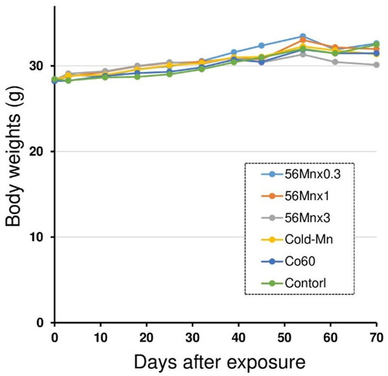Male C57BL mice were exposed to three different activities of 56MnO2 particles (Mn56 × 0.3, Mn56 × 1, or Mn56 × 3), nonradioactive MnO2 particles (Cold-Mn), 2 Gy of whole-body irradiation of 60Co γ-ray (Co60), or Control. The body weights steadily increased in every group after the exposure without significant differences among the groups during the study.