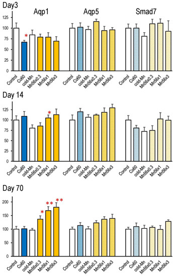 Relative mRNA expression levels of Aqp1, Aqp5, and Smad7 in the lung on days 3, 14, and 70 post exposure to 56MnO2 particles (Mn56 × 0.3, Mn56 × 1, and Mn56 × 3), nonradioactive MnO2 particles (Cold Mn), or 2Gy of external γ-rays (Co60). ** p < 0.01, * p < 0.05 vs. Control or Cold-Mn. Aqp1 expression started to increase on day 14, then significantly up-regulated in all Mn56 groups on day 71.