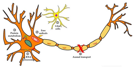 Several cellular and molecular processes underlie ALS development and lead to neurodegeneration and subsequent death of motor neurons (Figure 1). ALS pathophysiology is characterized by alterations at the level of RNA processing, with the appearance of aberrant and toxic RNAs that lose their functions. The disease also involves dysfunction in protein metabolism, inhibition of the ubiquitin-proteasome system (SUP), hyperactivation of autophagy, and disorders in proteins involved in axonal transport. On the other hand, it is considered that neurodegeneration occurs due to high levels of oxidative stress and difficulties in the elimination of free radicals, or through excitotoxicity produced by glutamate. Finally, alterations have been reported at the glial cell level (neuroinflammation), which affect motor neurons and lead to their degeneration [18].