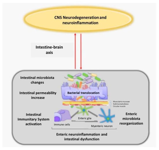Relationship of alterations in the intestinal microbiota and enteric nervous system with neuroinflammation and neurodegeneration of the CNS, through the connection of the intestine-brain axis CNS: central nervous system (figure modified from [72]).