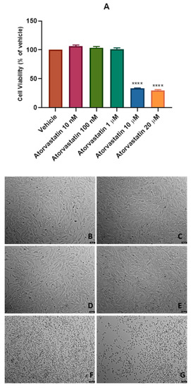 Effect of (A) atorvastatin 10 nM–20 µM in SH-SY5Y cellular viability (48 h) obtained by NR assay, and representative images (100 × total magnification) of these cells after incubation with (B) vehicle (DMSO 0.1%), (C) atorvastatin 10 nM, (D) atorvastatin 100 nM, (E) atorvastatin 1 µM, (F) atorvastatin 10 µM, and (G) atorvastatin 20 µM, after 48 h. Cell viability results are expressed as the percentage of the vehicle (100%). Statistical significance at **** p < 0.0001 vs. vehicle.