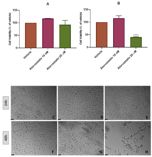 Effect of (A) atorvastatin 10 nM and 20 µM in SH-SY5Y cellular viability for 24 h and (B) for 48 h obtained by MTT assay, and representative images (100 × total magnification) of these cells after incubation with (C,F) vehicle (DMSO 0.1%), (D,G) atorvastatin 10 nM, and (E,H) atorvastatin 20 µM, after 24 h and 48 h. Cell viability results are expressed as the percentage of the vehicle (100%). Statistical significance at **** p < 0.0001 vs. vehicle.