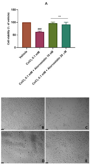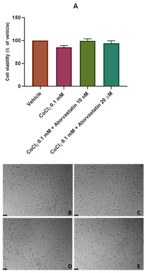 Effect of (A) CoCl2 0.1 mM, CoCl2 0.1 mM + atorvastatin 10 nM, and CoCl2 0.1 mM + atorvastatin 20 µM in SH-SY5Y cellular viability (24 h) obtained by MTT assay, and representative images (100 × total magnification) of these cells after incubation with (B) vehicle (sterilized water 2%/DMSO 0.2%), (C) CoCl2 0.1 mM, (D) CoCl2 0.1 mM + atorvastatin 10 nM, and (E) CoCl2 0.1 mM + atorvastatin 20 µM, after 24 h. Cell viability results are expressed as the percentage of the vehicle (100%).