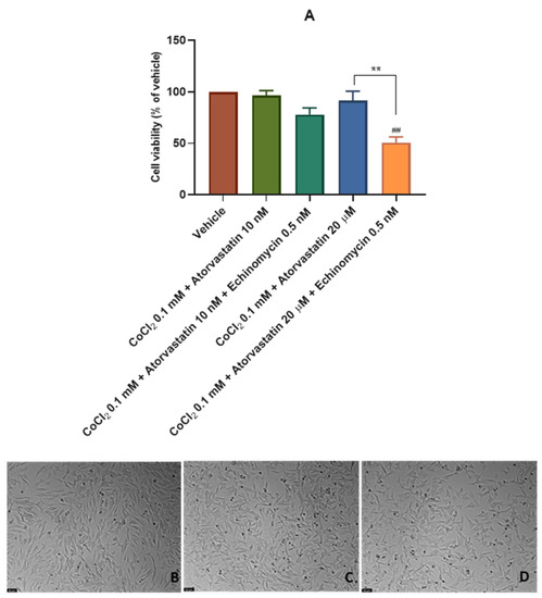 Effect of (A) CoCl2 0.1 mM + atorvastatin 10 nM, CoCl2 0.1 mM + atorvastatin 20 µM, CoCl2 0.1 mM + atorvastatin 10 nM + echinomycin 0.5 nM, and CoCl2 0.1 mM + atorvastatin 20 µM + echinomycin 0.5 nM in SH-SY5Y cellular viability (48 h) obtained by MTT assay, and representative images (100 × total magnification) of these cells after incubation with (B) vehicle (sterilized water 3%/DMSO 0.3%), (C) CoCl2 0.1 mM + atorvastatin 10 nM + echinomycin 0.5, and (D) CoCl2 0.1 mM + atorvastatin 20 µM + echinomycin 0.5 nM, after 48 h. Cell viability results are expressed as the percentage of the vehicle (100%). Statistical significance ## p < 0.01 vs. vehicle, and ** p < 0.01 CoCl2 0.1 mM + atorvastatin 20 µM vs. CoCl2 0.1 mM + atorvastatin 20 µM + echinomycin 0.5 nM.