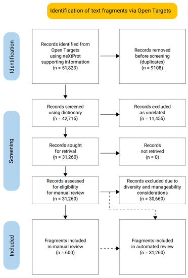 Technical realization. Open Targets data were downloaded and processed using R-scripts [14] written using the functionality of such packages as RCurl [15], jsonlite [16] and tidyverse [17]. Data from neXtProt were downloaded manually and processed using PHP, its extension XMLReader (https://www.php.net/manual/en/intro.xmlreader.php, accessed on 9 April 2023) tidyverse [18]. R package kofnGA [19] was used to select a diverse subset of text fragments for the manual analysis. R packages from the quanteda family were used to process text fragments [20]. R package caret was used to build classifiers [21]. R packages ggplot2 [22] and diagrammeR [23] were used to prepare plots, and a flow diagram describing the process of the review was created using Inkscape software (https://inkscape.org/, accessed on 9 April 2023).