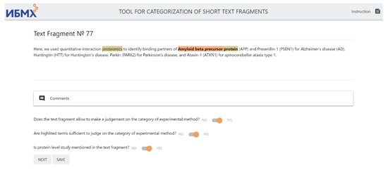 Detected terms related to the experimental method and names of the biological entities were highlighted in those text fragments. This could be illustrated by the following example, where the name of the biological entity is given in square brackets, and terms related to the level of study are presented in curvy brackets:
