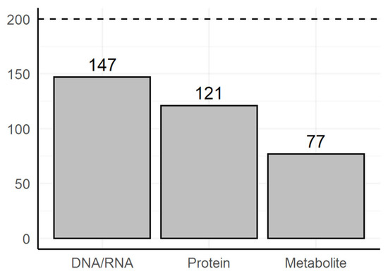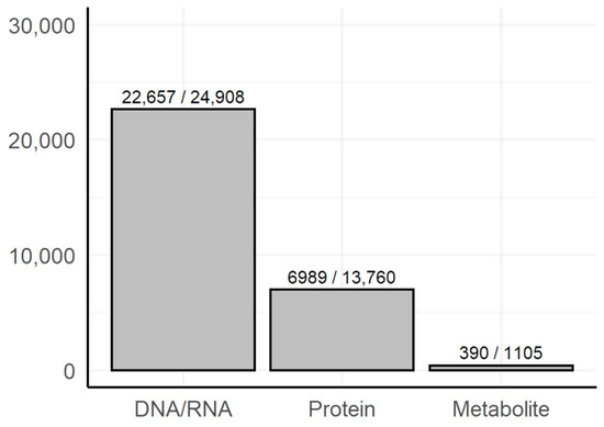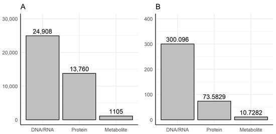 These results align with the current view of biomedical studies: analyzing nucleic acids is probably the most accessible and high-throughput option since polymerase chain reaction (PCR) allows one to study small quantities of biological material fast with affordable equipment [24]. Working with proteins is usually more demanding since there is no convenient way to multiply them in vitro [25]. Moreover, many proteins in varying concentrations form a complex mixture in the cell [26], which is hard to analyze quantitatively and qualitatively without expensive and intricate technological setups [27]. Analysis of the metabolite level also may be technically convoluted. Besides, it demands preexisting knowledge on the connection between metabolites and particular genes/proteins, and that limits the number of genes/proteins for which the association with the disease may be drawn through the metabolite.