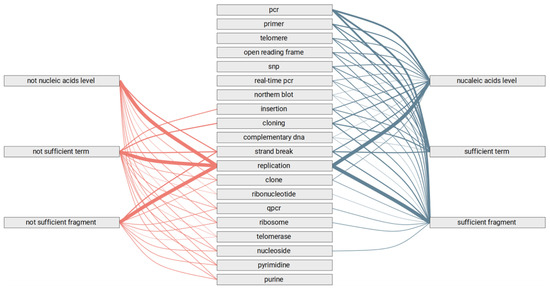 Association between the terms from the DNA/RNA category of the dictionary and answers obtained during the manual review. Thicker lines connecting the term and an answer mean more cases. Blue lines connect terms and positive answers. Red lines connect the terms and negative answers.