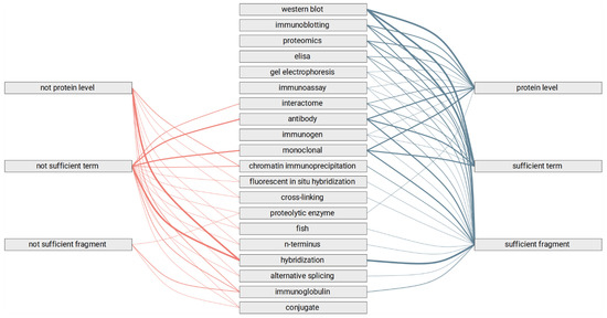Association between the terms from the protein category of the dictionary and answers obtained during the manual review. Thicker lines connecting the term and an answer mean more cases. Blue lines connect terms and positive answers. Red lines connect the terms and negative answers.