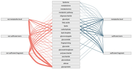 Association between the terms from the metabolite category of the dictionary and answers obtained during the manual review. Thicker lines connecting the term and an answer mean more cases. Blue lines connect terms and positive answers. Red lines connect the terms and negative answers.