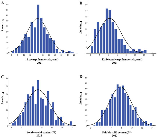 In 2022, we further measured the SSC of the parents and their F1 and F2 populations. The SSC value of the two parents and F1 population in 2022 was consistent with that from the previous two years (i.e., 2018 and 2021). However, the SSC value of the F2 population in 2022 was lower than that of the previous two years. SSC of the F2 generation showed continuous normal distribution (Figure 2D, Table 2).