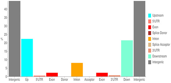 The genome sequencing revealed 53.85% non-synonymous SNPs and 46.15% polymorphic SNPs, of which 44.68%, 21.39%, 22.27%, 0.01%, 0.01%, 0.17%, 0.74%, 0.51%, 8.01%, and 2.21% were located in the intergenic, downstream, upstream, splice acceptor, splice donor, splice region, 3′ UTR, 5′ UTR, intron, and exon regions, respectively (Figure 3).