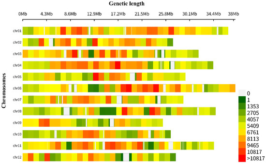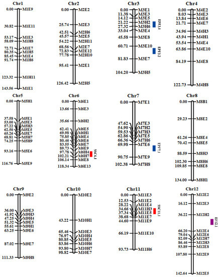 The genetic linkage maps of the 2021 F2 populations of M4-5 and M1-15 were constructed with the 116 SNP-CAPS markers (Figure 5). Table 3 shows the marker distribution on each chromosome. The linkage map consisted of 12 linkage groups, with the largest number of CAPS markers located on chromosome 6, which has a total length of 118.34 cM and an average CAPS marker distance of 9.10 cM. The average genetic distance of the 116 CAPS markers was 12.20 cM, whereas the overall genetic distance of the 12 linkage maps (whole genome) was 1414.88 cM (Table 4).