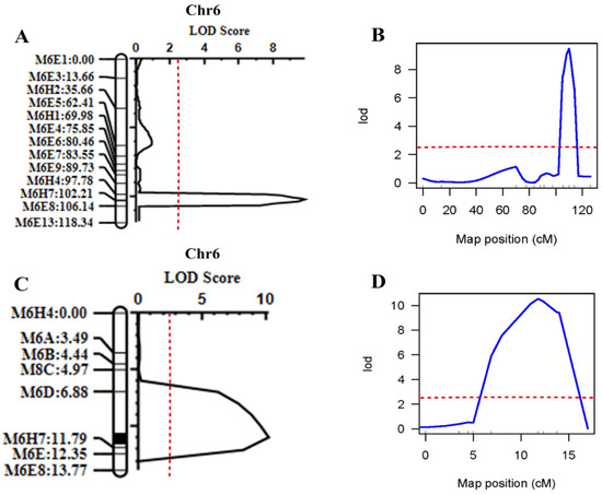 Two different QTL software (QTL IciMapping (v4.0) and R/qtl v1.5), identified a major effective QTL between CAPS markers M6H4 and M6E8 that is closely linked to the SSC trait. The intervals of CAPS markers in both software were roughly the same (Figure 6A,B).