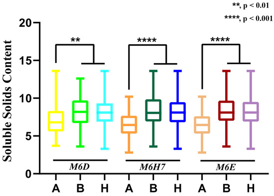 Three markers flanking mapped QTL region and linked to the fruit SSC (Figure 7) were used to analyze the genotype–phenotype correlation of 2022 F2 population to verify the accuracy of the QTL mapping results. The P1, P2, and F1 populations had genotype A (low SSC), genotype B (high SSC), and genotype H (SSC between P1 and P2), respectively. In the F2 population, the significance of M6H7 and M6E among the three markers was most prominent, showing a greater probability of QTL between these two loci. These results further demonstrated the reliability of the QTL findings.