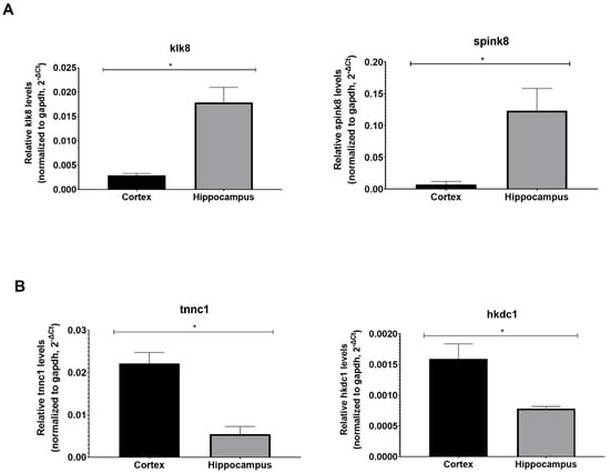 Markers of the two brain regions: the cortex and the hippocampus. mRNA levels of the brain region markers were measured in the dissected cortex and hippocampus through real-time PCR. Results are the means ± SEM from three lots of cerebral structures from three mice and the PCR performed in duplicate for each single preparation. Statistical comparisons: * p < 0.05.