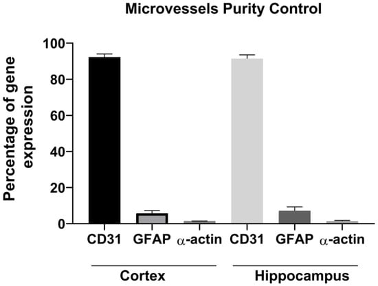 Markers of each of the two brain regions (cortex and hippocampus), selected from the “Human Brain Atlas” (protein atlas.org) were measured through real-time PCR on the whole structures. The list of primers for the brain region markers is represented in Table 1. The brain endothelial capillaries were isolated and their purity was checked by measuring the expression of the marker genes for brain endothelial cells (CD31 or PECAM), for glial cells (glial fibrillary acid protein or GFAP), and for pericytes (α-actin). The following mouse primers from Macrogen (Republic of Korea) were used: Pecam1 Mouse qPCR Primer Pair (NM_008816), F: CCAAAGCCAGTAGCATCATGGTC, R: GGATGGTGAAGTTGGCTACAGG; Gfap Mouse qPCR Primer Pair (NM_010277), F: CACCTACAGGAAATTGCTGGAGG, R: CCACGATGTTCCTCTTGAGGTG; Acta2 Mouse qPCR Primer Pair (NM_007392), F: TGCTGACAGAGGCACCACTGAA, R: CAGTTGTACGTCCAGAGGCATAG.