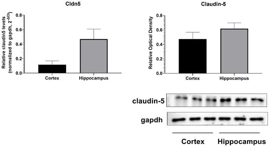 Claudin-5 is a tight junctional protein that enters in the composition of inter-endothelial tight junctions []. Our result showed a tendency toward the increase of the claudin-5 gene expression in the hippocampus compared to the cortex, with no significant changes observed at the protein level (Figure 3).