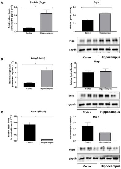 Regarding the expression of the ABC efflux transporters, our results showed a significant increase in the P-gp gene (p = 0.0221) and protein expression (p = 0.0337). The Bcrp gene expression was found to be statistically higher in the hippocampus (p = 0.022) compared to the cortex with no significant changes at the protein levels, while the abcc1 gene expression was found to be higher in the cortex (p = 0.0143) with no significant changes observed in the protein expression. These data indicate potential differential efflux activity in the two brain regions, however, this expression analysis should be complemented by efflux activity studies to confirm the differential efflux activity.
