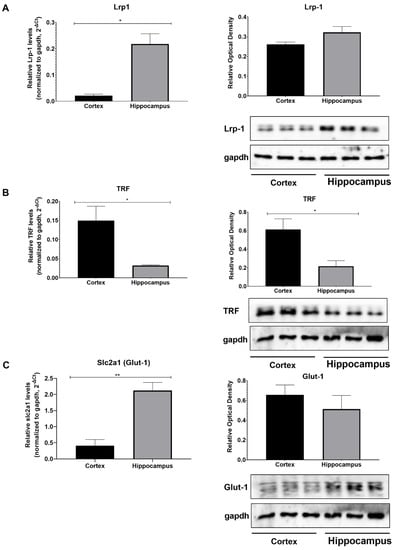 Levels of the receptor (Lrp-1, transferrin receptor and GLUT-1) in mouse brain micro vessels isolated from the cortex and the hippocampus. (A–C) The relative mRNA levels of Lrp1 (A), TRF (B), and slc2a1 (C) were assessed through real-time PCR. GAPDH was used as an internal standard. Data are represented as (2−ΔCt). The protein expressions of Lrp-1 (A), TRF (B), and GLUT-1 (C) were examined by Western blot. Optical densities were analyzed with Image Lab 6.0.1 software (Bio-Rad) and normalized to GAPDH. Results are the means ± SEM from three lots of brain endothelial micro vessels (each lot represents a pool from five mice). Statistical comparisons: * p < 0.05 and ** p < 0.01.