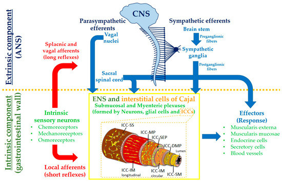 Representation of link between central nervous system (CNS), autonomic nervous system (ANS) and enteric nervous system (ENS). Location of interstitial cells of Cajal (ICCs) sub-types according to the gastrointestinal layer. ICC-SM: ICC of submucosa; ICC-DMP: ICC of deep muscle plexus; ICC-IM: ICC of intramuscular layer; ICC-MP: ICC of myenteric plexus; ICC-SS: ICC of sub-serosa. Modified from [11].