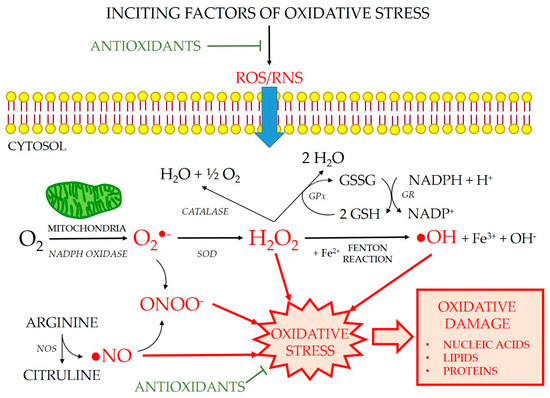 Oxidative stress (Figure 4) is defined as an imbalance between pro- and anti-oxidant molecules due to an excess of pro-oxidants (by exposure to ionizing radiation, intense ultraviolet radiation, toxins, psychological or physical stress, and diseases), antioxidant deficiency (in newborns, during aging, or due to vitamin-poor diets), or by a combination of both situations at the same time [44]. The action of FR on the cellular structural constituents produces a continuous internal aggression, which threatens the integrity of all biomolecules. Oxidizable substrates include all organic or inorganic molecules found in living cells, such as proteins, lipids, carbohydrates, and deoxyribonucleic acid molecules [45]. Oxidative damage to lipids, especially polyunsaturated fatty acids in biological membranes, is widely investigated [46]. The lipid peroxidation reaction is a degenerative process of chain oxidations that spreads across the surface of lipid bilayers and alters their fluidity and permeability, favoring the occurrence of chemotaxis and inflammation [47,48].