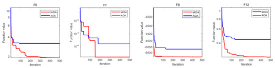 Convergence curves of functions F6, F7, F8, and F12. The blue and red curves represent the convergence curves of the AOA and IAOA, respectively; the horizontal axis denotes the number of iterations, where the maximum number of iterations is 500; the vertical axis presents the optimal value of the objective function.
