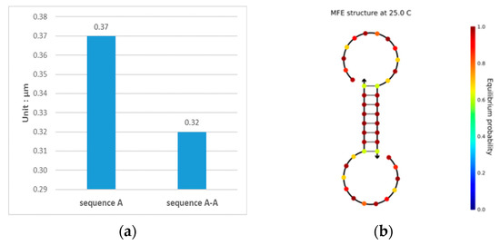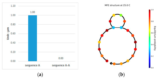 When a DNA sequence is evaluated using NUPACK, a self-complementary reaction may occur when a DNA sequence is added to the solution, as shown in Figure 2. The sequence shown in Figure 2 was taken from the study of Chaves-González et al. [39], and it was obtained when a 1-μm sequence was fed to the NUPACK input. Figure 2a shows that there is a structural sequence A-A in the solution other than sequence A, and at this point, , and . The concentration of sequence A in the solution is reduced, indicating that the quality of the sequence has decreased. Thus, the chance of errors in the reaction during DNA storage increases. The structure of sequence A-A is shown in Figure 2b, where it can be seen that the underlined six bases undergo complementary pairing reactions in the solution, forming a stable pairing structure. The pairing structure is not expected, and it makes the original sequence less concentrated, while the c-value decreases due to the presence of a stable and unavailable structure.
