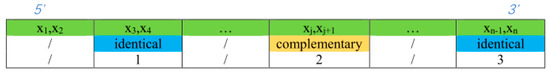 Double-matching constraint. The bases are connected according to the 5′ -> 3′ end arrangement. The first line of data in the figure denotes sequence with a base number ; two consecutive bases are a combination, divided into base combinations, such as , assuming that is the original base combination and looking for the base combination associated with it in the sequence. The second row of data indicates the relationships between the current base combination and ; “identical” means the two combinations are identical, and “complementary” means the two combinations are complementary. The third row of data denotes the number of combinations in the sequence that are identical or complementary to , that is, the in Equation (14). There are four combinations that are related, including the combination . Therefore, the bases of one of the combinations , , and are selected for replacement, and then it is re-judged ; if so, then the base replacement continues; otherwise, the next base combination is selected as the original base combination, scanning continues, and the above steps are repeated.