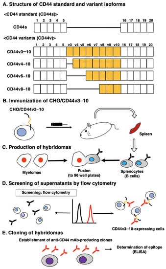 Several isoforms of the CD44 are associated with malignant progression in various tumors [], including head and neck squamous cell carcinomas (HNSCCs) [], pancreatic cancers [,], breast cancers [], gliomas [,], prostate cancers [], and colorectal cancers (CRC) []. CD44 is also known as a cell surface marker of cancer stem-like cells (CSCs) in various carcinomas []. Specific monoclonal antibodies (mAbs) to CD44s or CD44v are utilized for sorting CD44high CSCs []. The CD44high population exhibited the increased stemness property, drug resistance, and tumor formation in vivo []. Therefore, development of anti-CD44 mAbs, which recognize each variant, is important for the further characterization of CSCs in various cancers.