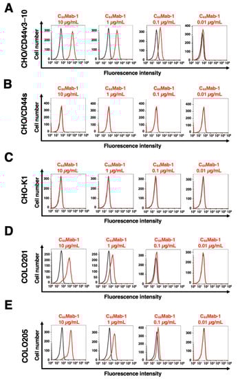Flow cytometry using C44Mab-1. CHO/CD44v3–10 (A), CHO/CD44s (B), CHO-K1 (C), COLO201 (D), and COLO205 (E) were treated with 0.01–10 µg/mL of C44Mab-1, followed by treatment with Alexa Fluor 488-conjugated anti-mouse IgG (Red line). The black line represents the negative control (blocking buffer).