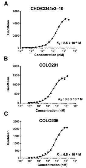 We next performed the flow cytometry-based measurement of the apparent binding affinity of C44Mab-1 to CHO/CD44v3–10, COLO201, and COLO205 cells. As shown in Figure 3, the dissociation constant (KD) of C44Mab-1 for CHO/CD44v3–10 (Figure 3A), COLO201 (Figure 3B), and COLO205 (Figure 3C) was 2.5 × 10−8 M, 3.3 × 10−8 M, and 6.5 × 10−8 M, respectively. The results indicated that C44Mab-1 possesses a moderate binding affinity for CD44v3–10 or endogenous CD44v9-expressing cells.