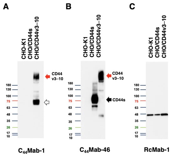 Western blot analysis by C44Mab-1. The total cell lysates (10 µg of protein) were separated and transferred onto polyvinylidene difluoride (PVDF) membranes. The membranes were incubated with 10 µg/mL of C44Mab-1 (A), 10 µg/mL of C44Mab-46 (B), or 1 µg/mL of RcMab-1 (C), followed by incubation with peroxidase-conjugated anti-mouse (for C44Mab-1 and C44Mab-46) or anti-rat (for RcMab-1) immunoglobulins. The red arrows indicate the CD44v3–10 (>180 kDa). The black arrow indicates CD44s (~75 kDa). The white arrow indicates the lower molecular weight band recognized by C44Mab-1 in CHO/CD44v3–10 lysate (~75 kDa).