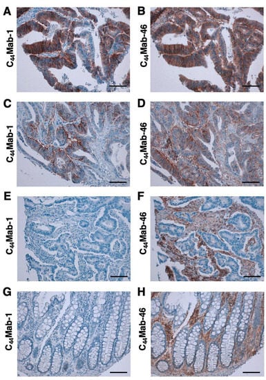 Immunohistochemical analysis using C44Mab-1 and C44Mab-46 against CRC tissues. After antigen retrieval, serial sections of CRC tissue arrays (CO483a) were incubated with 1 µg/mL of C44Mab-1 or C44Mab-46 followed by treatment with the Envision+ kit. The color was developed using 3,3’-diaminobenzidine tetrahydrochloride (DAB), and the sections were counterstained with hematoxylin. Scale bar = 100 µm. CRC (A–F); normal colon epithelium (G,H).