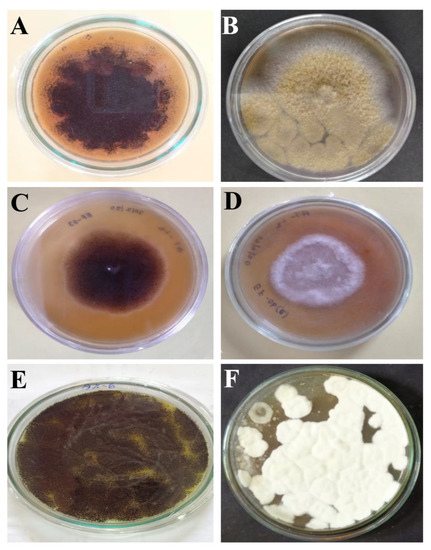 Isolation of different fungi from the collected soil samples. (A) AK-1, (B) AK-2, (C) AK-3, (D) AK-4, (E) AK-6, and (F) AK-7.
