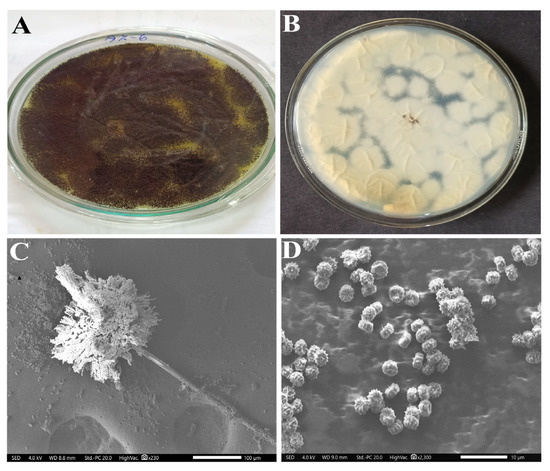 Morphological characterization of isolate AK-6. (A) aerial mycelium, (B) substrate mycelium, (C) scanning electron microscope image showing conidiophores and (D) scanning electron microscope image showing spore morphology.