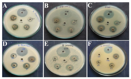 Antimicrobial activity of ethyl acetate extract of isolate AK-6. (A) K. pneumonia, (B) C. albicans, (C) E. coli, (D) S. flexneri, (E) B. subtilis and (F) S. aureus.