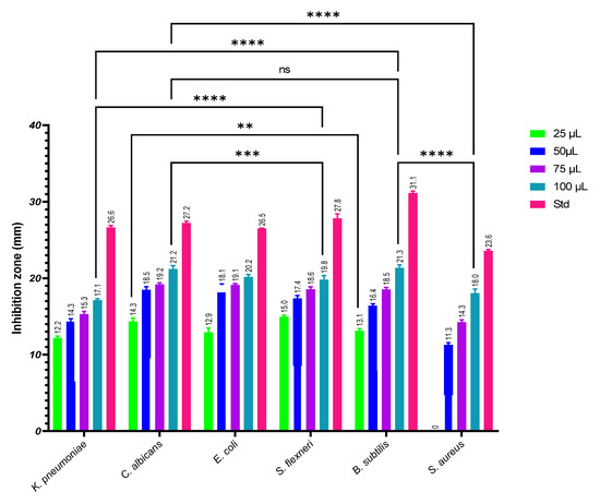 Graphical representation of the antimicrobial activity of ethyl acetate extract isolate AK-6 against pathogenic microorganisms. Two-way ANOVA with Tukey’s multiple comparisons was performed to identify group differences. p < 0.01 (**), p < 0.001 (***), and p < 0.0001 (****). ns: not significant.