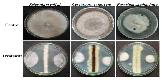 The antifungal activity of isolate AK-6 was assessed by the dual culture method against three phytopathogens, namely, Sclerotium rolfsii, Cercospora canenscens, and Fusarium sambucinum (Figure 5). The results show 47.2% inhibition against Sclerotium rolfsii, 59.4% against Cercospora canenscens and 64.1% against Fusarium sambucinum. The highest antifungal activity was exhibited against Fusarium sambucinum, and the most negligible action against Sclerotium rolfsii. All the results have been compared with the respective phytopathogens grown in control plates. A graphical representation of the antifungal activity of isolate AK-6 is depicted in Figure 6.