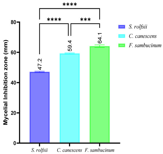 Graphical representations of antifungal activity of isolate AK-6 against phytopathogens assessed by dual culture assay. Two-way ANOVA with multiple comparisons was accomplished to identify group differences. p < 0.001 (***), and p < 0.001 (****).