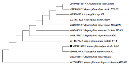 The selected Aspergillus niger strain AK-6 fungus was identified by 18S rRNA gene sequencing. The fungal sequence of 956 base pairs with the accession number OP071595 was blasted through nucleotide blast (BLASTN) in the NCBI database to find the closely related fungal species. From the analyzed data, the 18S rRNA gene sequence of the AK-6 revealed 99.79% sequence similarity with the Aspergillus niger strain JC. Further, a phylogenetic tree was reconstructed through the neighbor-joining method with obtained gene sequences. The phylogenetic tree analysis revealed that the Aspergillus niger strain AK-6 fell within the cluster of the genus Aspergillus, and formed a branch with the Aspergillus niger strain JC, as represented in Figure 7. The 18S rRNA gene sequencing was the most promising mode of molecular characterization, enacted to identify the fungal isolates by amplifying 18S rRNA, which facilitates the phylogenetic variation among the fungal isolates [53]. Similarly, Waing et al. (2015) identified five fungal species, Aspergillus eucalypticola, Aspergillus fumigatus, Colletotrichum gloeosporioides, Fusarium oxysporum and Penicillium echinulatum, by ITS sequences and BLAST analysis [54].