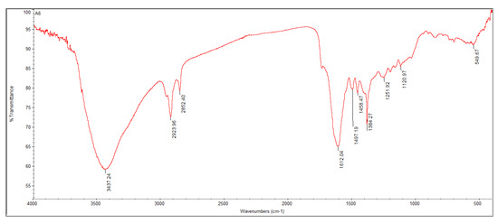 FTIR analysis of the Aspergillus niger strain AK-6 shows absorption peaks at 3437, 2923, 2852, 1612, 1497, 1458, 1384, 1251, 1120 and 549 cm−1, which represent different functional groups (Figure 8). The medium and sharp absorption peaks at 3437 and 2923 cm−1 correlate with O–H stretching alcohol and C–H stretching alkane. The sharp, strong peaks at 2852 and 1612 cm−1 represent C–H stretching alkane and the α, β-unsaturated ketone. The absorption peaks at 1497 and 1458 cm−1 depict N–O stretching nitro compound and C–H bending alkane. The presence of S=O stretching sulfate and C–N stretching alkyl aryl ether have been confirmed by the existence of absorption peaks at 1384 and 1251 cm−1, respectively. The weak and medium peaks at 1120 and 549 cm−1 correspond with C–O stretching aliphatic ether and C–I stretching halo compound (Table 2).