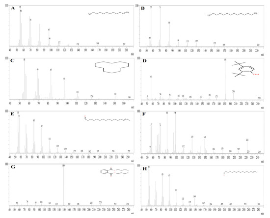 Mass spectra of individual metabolites found in ethyl acetate extract of the Aspergillus niger strain AK-6. (A) 1-Dodecene, (B) tetradecane, (C) cyclodecane, (D) 2,4-di-tert-butylphenol, (E) E-14-hexadecenal, (F) N-didehydrohexacarboxyl-2,4,5-trimethylpiperazine, (G) dibutyl phthalate and (H) E-15-heptadecenal.