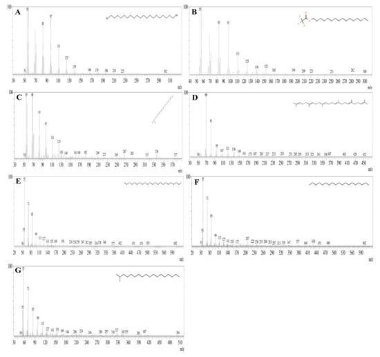 Mass spectra of individual metabolites found in ethyl acetate extract of the Aspergillus niger strain AK-6. (A) 1-Heneicosanol, (B) trifluroacetoxy hexadecane, (C) cyclopentane, heneicosyl, (D) squalene, (E) tricosane, (F) nonadecane and (G) octadecane 2 methyl.
